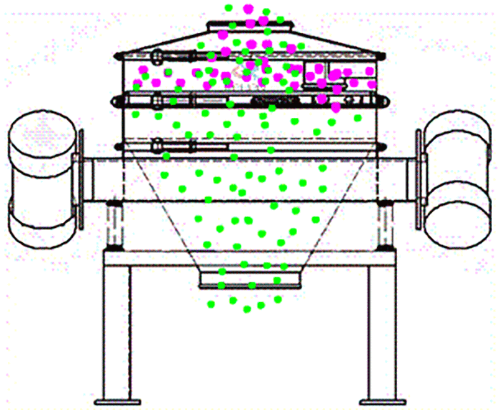 直排振動篩結構分為進料口、防塵蓋、篩框篩網、束環、出料口、電機、彈簧和底座。